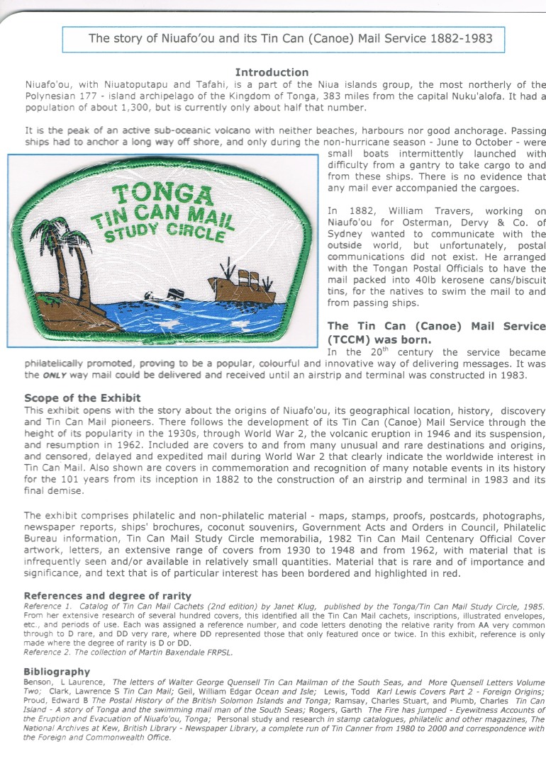 John Davis. The Story Niuafo'ou and its Tin Can (Canoe) Mail Service 1882 - 1983. Stockholmia 2019. Open Philately exhibit.