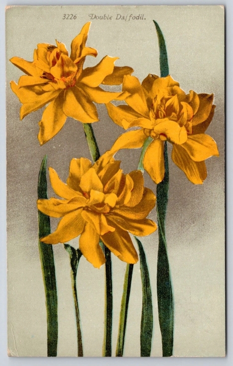The display was in two parts, firstly postcards and then his ‘collection’ of anything daffodil-themed. It seems there are around 16,000 to 20,000 daffodil cultivars bred today, making it a huge business, with more daffodils bought in the UK than anywhere else in the world. And they’ve been around a long time, originating as wild flowers in the Atlas Mountains, and were first been imported into this country in the Iron Age, or perhaps even the Bronze Age, following trade routes from what is now Spain to Wales. To this day daffodils flower in the frounds of what were Roman forts.